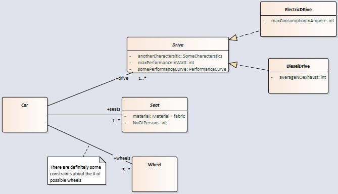 所以,这是描述汽车的一种方式。有更多的方法需要长时间的讨论。无论如何,您应该请一位能流利地说UML的顾问(换句话说,他擅长建模)。