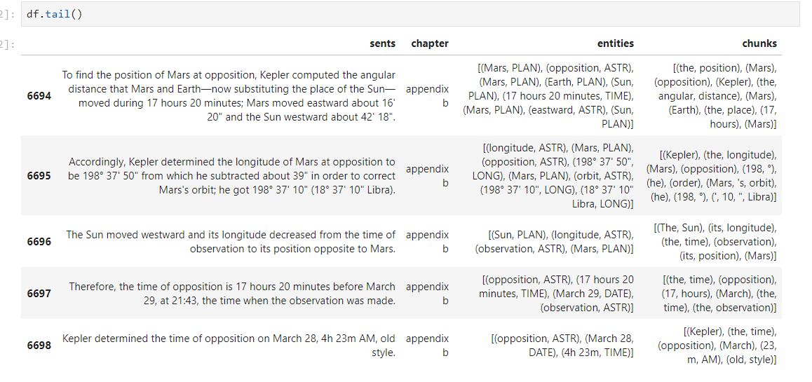 如果有人能给我指路,那就太好了,非常感谢。这里是我的数据框架的屏幕拍摄,实体是由一个定制的spaCy模型提供的。我可以访问每个句子的语法依赖和部分词性标记,如spaCy提供的: