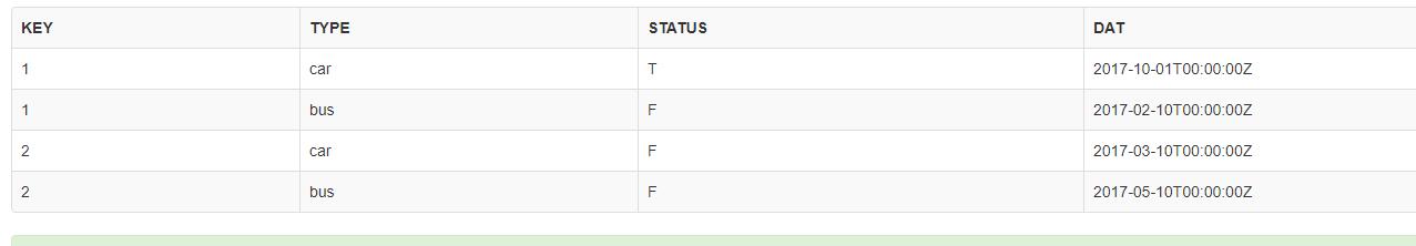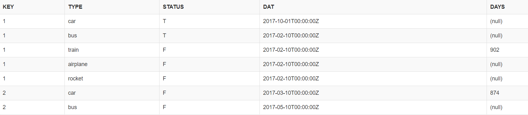 如果你总是有一辆车和一辆公共汽车,而且只有一辆车和一辆钥匙相同的公共汽车,你可以自己加入这个表,并检查车辆a (你正在查询的)是否是状态为F的汽车,或者相关的verhicle,b,是否是一辆状态为T的汽车。在这两种情况下,你都会得到一个约会,而在其他情况下,你没有。这包括了你的例子,还意味着如果汽车和巴士都是T,那么日期仍然只显示在巴士旁边。