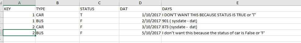 select key, status, dat, sysdat, (case when key = 1 and type = 'Car' status = 'F' then round( sysdat-dat,2) else 0 end ) as Days, (case when key = 1 and type ='Bus' and Status = 'F' then round( sysdat-dat,2) else 0 end) as Days from ABC