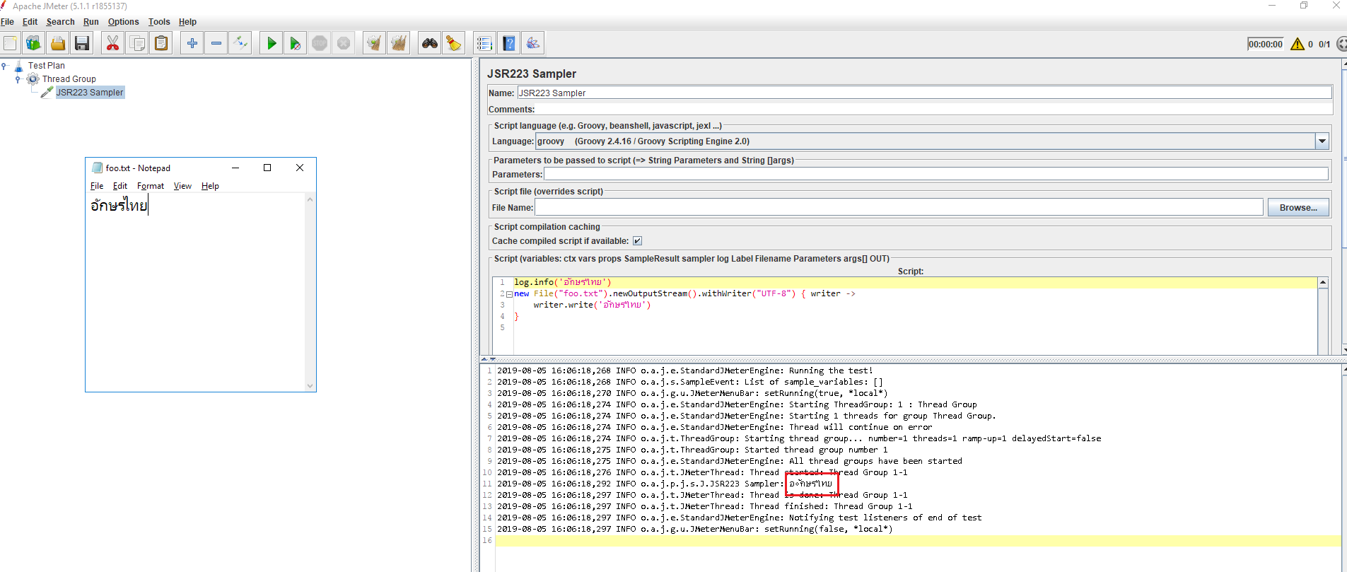 当我使用JSR223采样器并打印非英语字符作为อักษรไทย时