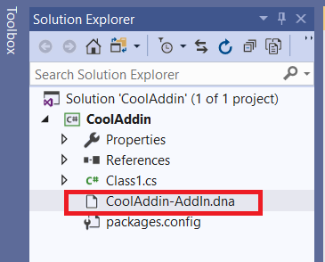 打包文件的基本名称是由.dna包的NuGet Package Manager安装脚本自动生成的Excel.Dna文件名。CoolAddin-Addin.dna在这种情况下。