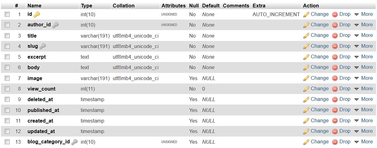 belongsTo函数在posts表中接受外键名称的第二个参数,如果不提供它,框架将尝试猜测外键列名是什么,在您的例子中是category(),因此框架正在搜索category_id,但是,您的外键列名是blog_category_id。