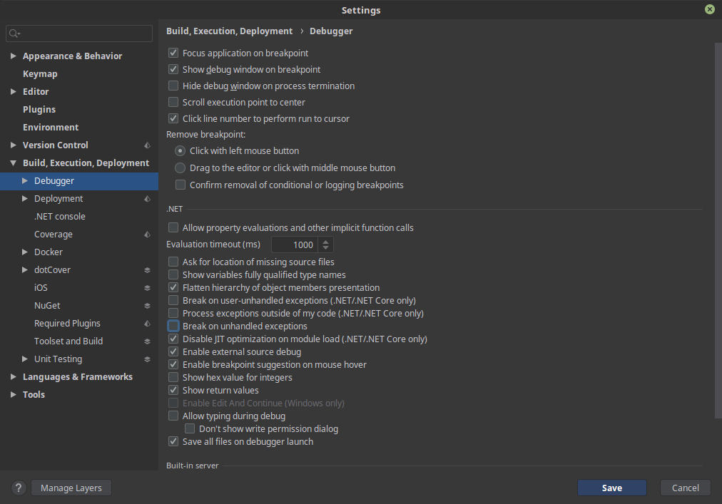 2.禁用首选项\x构建、执行、部署/调试器->打破未处理的异常