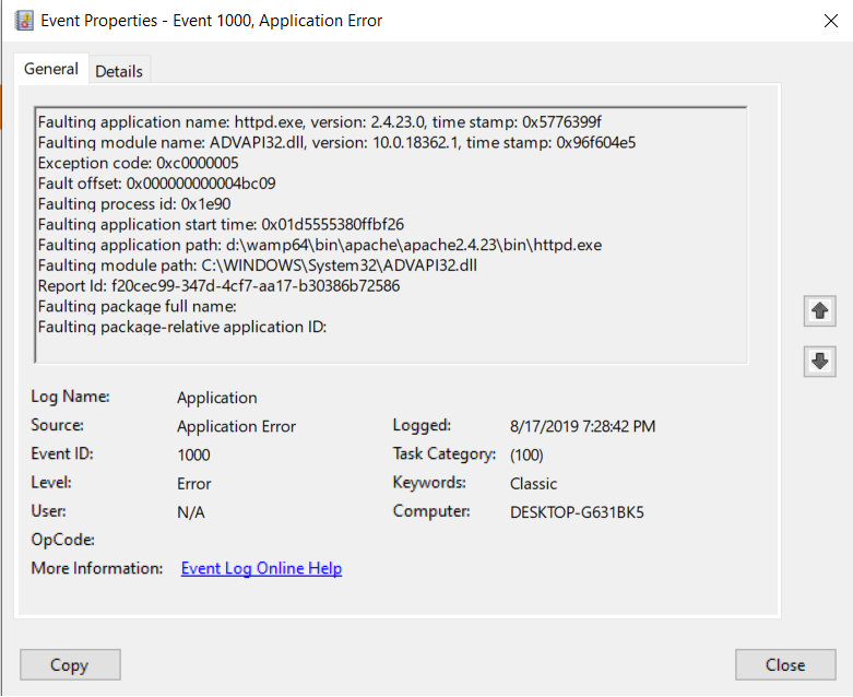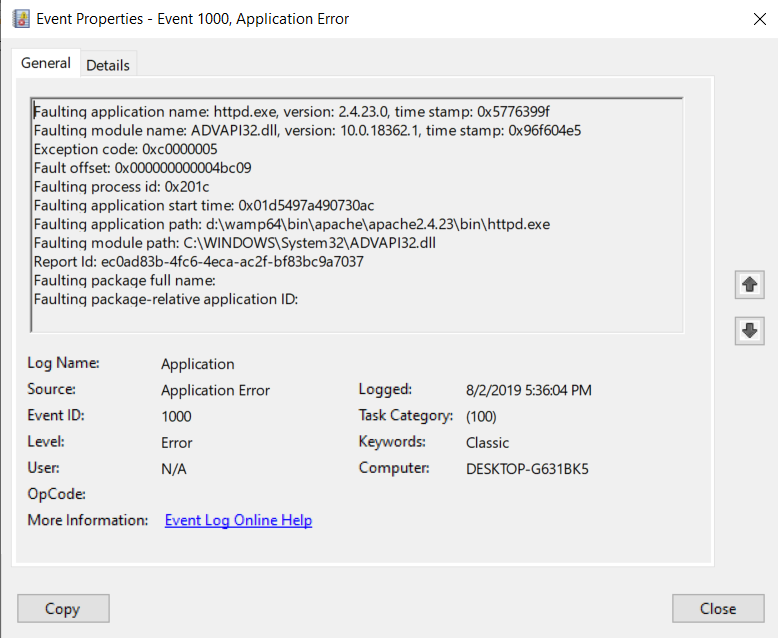 现在重新启动电脑,只是为了确定!然后尝试启动WAMPServer。现在查看\wamp64\logs文件夹中的"apache_error.log“,并启动事件查看器并查看该事件查看器,看看WAMPServer版本的Apache生成了哪些错误。