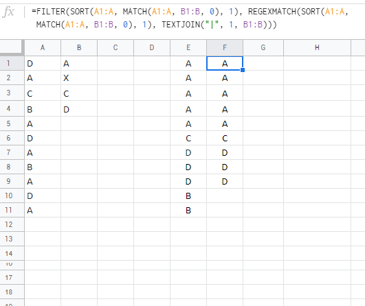 =FILTER(SORT(A1:A, MATCH(A1:A, B1:B, 0), 1),