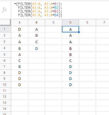 =FILTER(A1:A10, B1:B4=$B1)问题是,当您拖动和应用上述公式时,因为有多个结果,所以您不需要立即使用该公式,而必须单独执行,并且必须手动执行