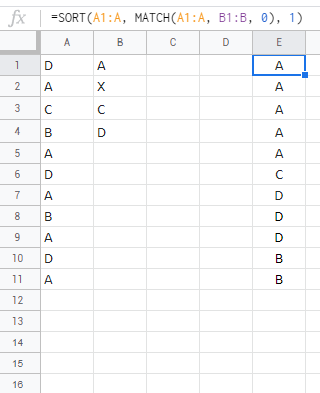=SORT(A1:A, MATCH(A1:A, B1:B, 0), 1)
