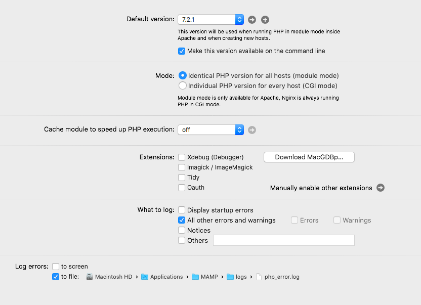 我正在使用MAMP版本4.4.1,列出的最新可配置PHP版本是7.2.1 (这是可以接受的,因为这些包的需求范围从7.1到7.2。