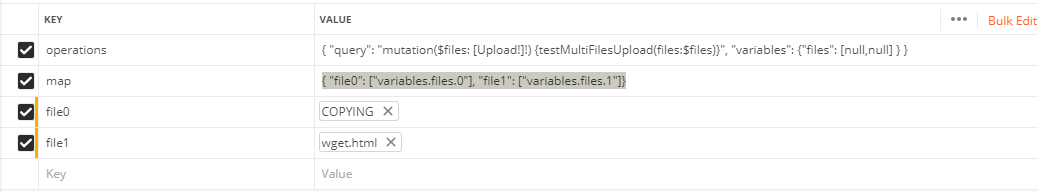 }操作{“查询”:“突变($files: Upload!!) {testMultiFilesUpload(文件:$文件)}”,“变量”:{“文件”:null }映射{ " file0 ":"variables.files.0“,”file1“:”variables.file.1“}file0文件file1文件