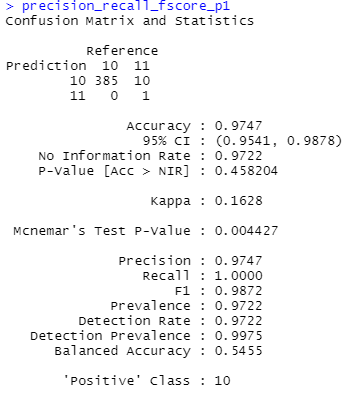 现在,我想从precision包中用confusionMatrix计算confusionMatrix、recall和f-score。
