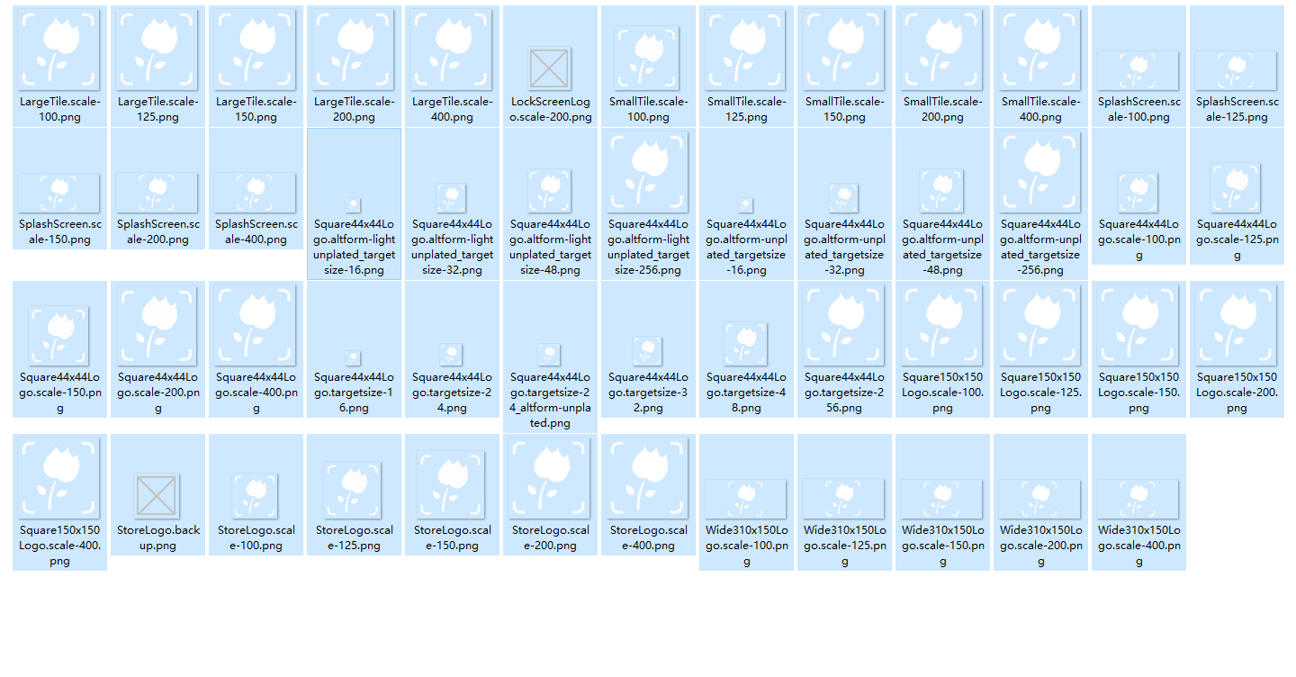 在图标文件夹中,查找名为Square44x44Logo.altform-unplated_targetsize-256.png的文件。根据分辨率,该系列共有5个图标,分别为256、48、32、24、16。