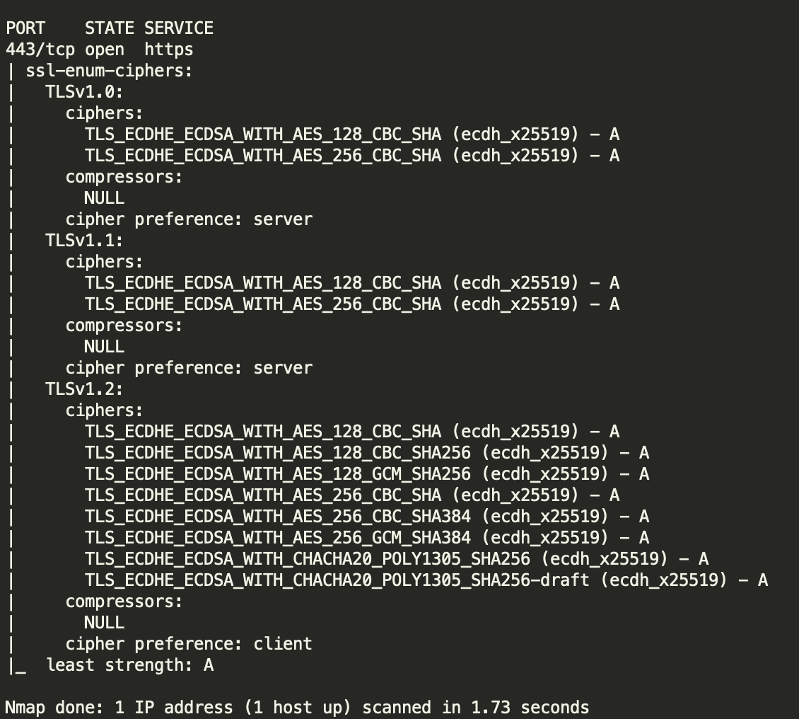 如果您希望进行更全面的测试,请安装NMAP,然后下载ssl-enum-密码脚本。安装NMAP并下载脚本之后,针对您的域执行脚本: