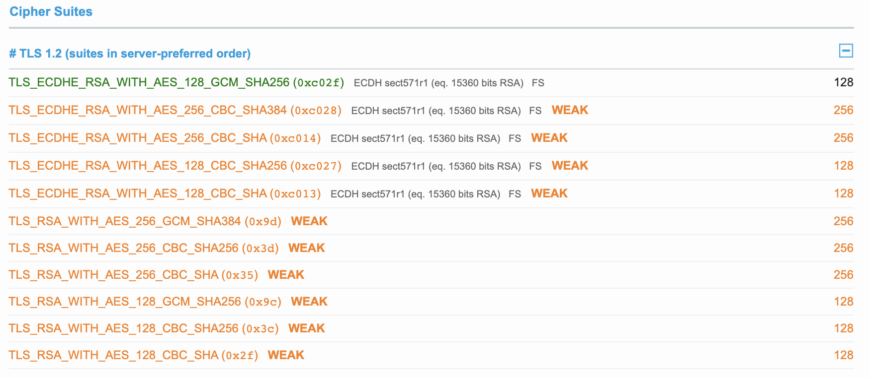 TLS_RSA_WITH_AES_128_CBC_SHA256最简单的方法之一是使用SSL实验室证书检查器。只需输入根域并让报表运行(只需几分钟)。在报告响应中,查找密码套件部分,并验证苹果想要的TLS密码器是否可用。在下面的图片中,你可以看到它们是橙色的,标记为弱的。