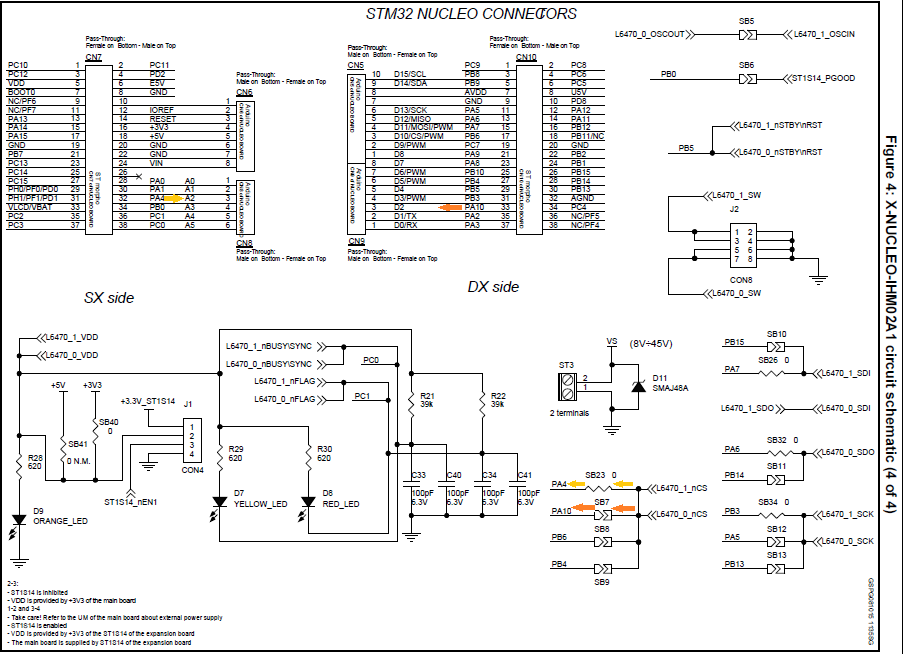 查看Nucleo原理图,您会注意到L6470_1_SDO (串行数据输出)连接到L6470__SDI (Serial )。这是雏菊链的配置。还请注意桥接SB7如何引导到板上的D2引脚。