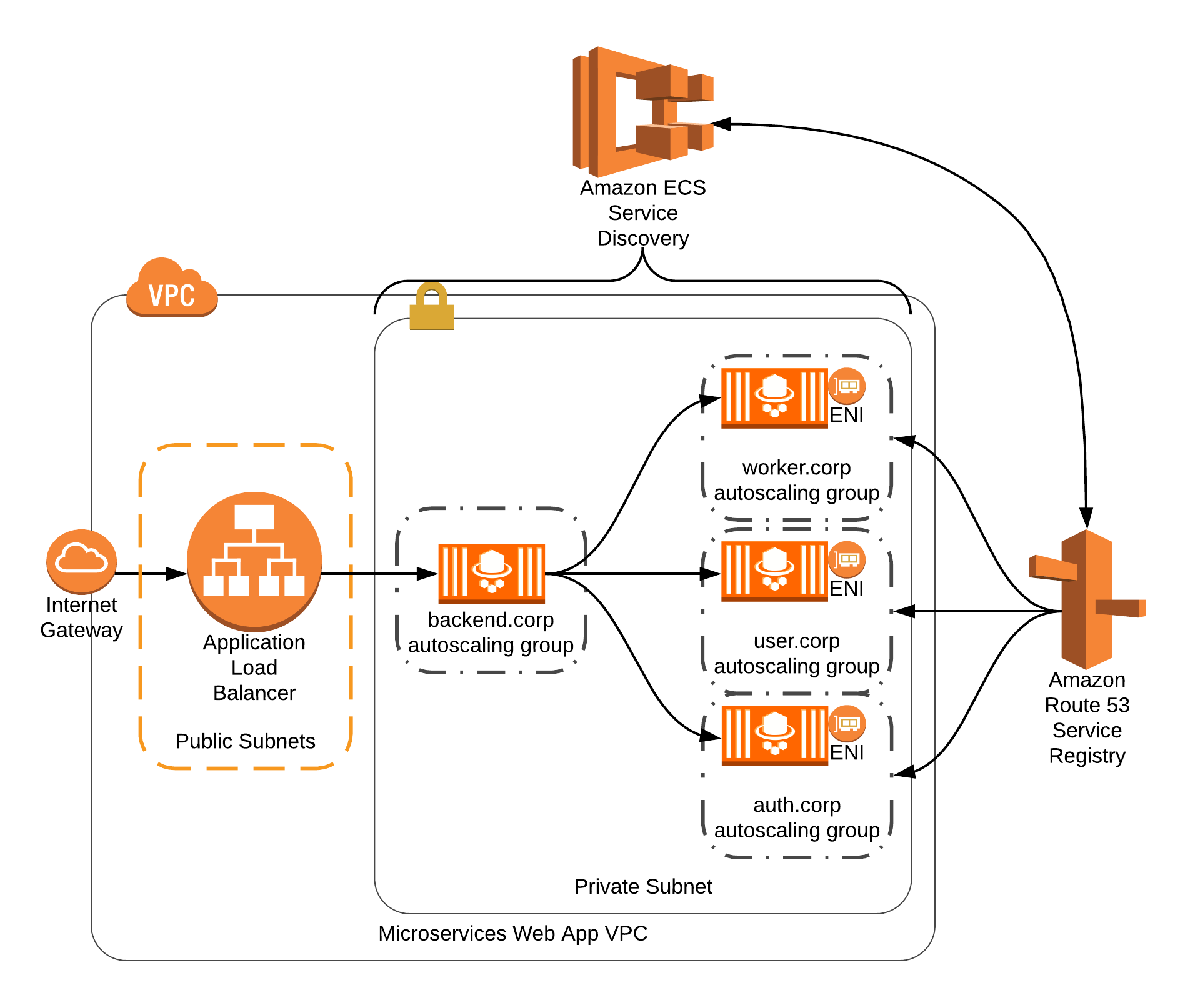 AWS负载均衡器(用于公共访问)和Amazon服务发现(用于内部通信)的组合是web应用程序的最佳选择。