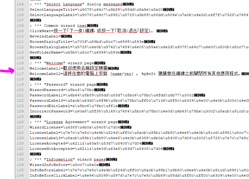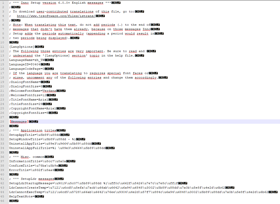 我正在使用Inno安装版本6和之前,我使用的非官方翻译文件,从Inno安装网站为韩国和中国传统语言,他们工作良好,但我们有我们自己的翻译团队,以核实翻译,并将其转换成Unicode。但是这些字符在最终的设置和显示时并没有被转换。