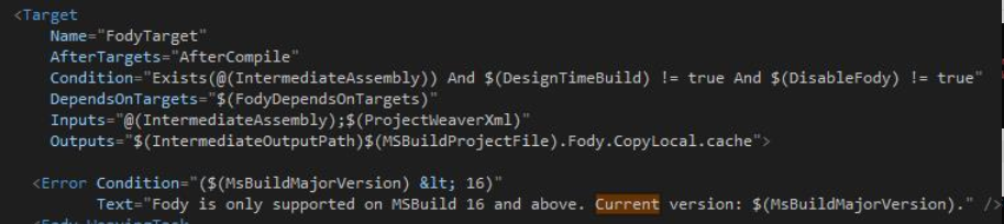 这是底层fody文件的一部分。您可以看到,它被定义为只有您的MSbuild版本为16,否则它会像您收到的那样抛出错误消息。