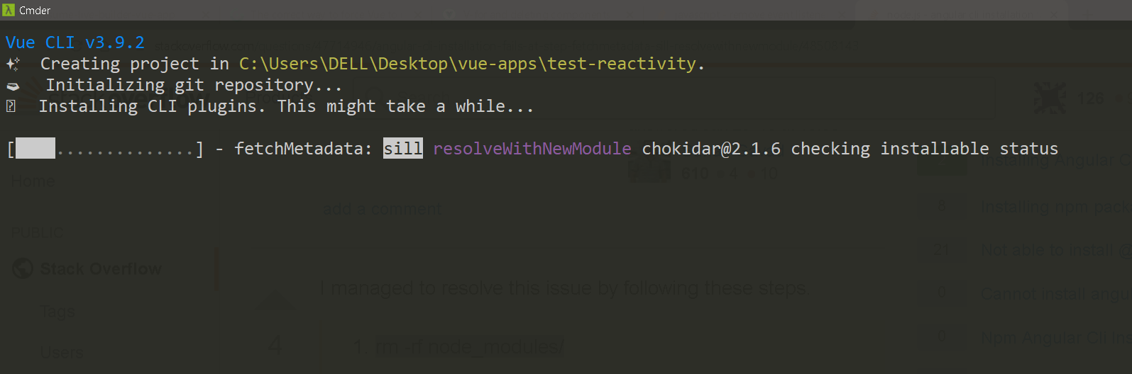 但是,CLI在获取元数据(chokidar@2.1.6)时冻结: