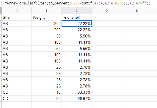 ={"% of Shelf"; arrayformula(if($B$15:$B="","",$H$15:$H/sum(filter(H:H,A:A=A15))))}还有别的方法我应该采取吗?一般来说,我不太熟悉数组公式,但是由于我将拥有的行数是可变的,所以我不希望使用简单的SUMIFS而不使用数组公式。