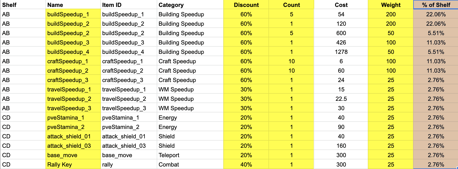 我试图在谷歌表格中构建一个数组公式,根据货架上所有项目的加权概率,计算某一项在给定货架上的出现百分比。例如,如果货架A包含1、2和3项,每个项目的重量为10,则每个项目占用的货架百分比为10 / sum(10+10+10)。货架上有多个架子,每个架子上有不同重量的物品。