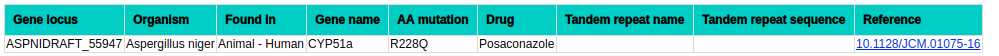 s = '<table id="datatable"><tr><th onclick="sortTable(0)">Gene locus</th><th onclick="sortTable(1)">Organism</th><th onclick="sortTable(2)">Found in</th><th onclick="sortTable(3)">Gene name</th><th onclick="sortTable(4)">AA mutation</th><th onclick="sortTable(5)">Drug</th><th onclick="sortTable(6)">Tandem repeat name</th><th onclick="sortTable(7)">Tandem repeat sequence</th><th onclick="sortTable(8)">Reference</th></tr><tr><td>ASPNIDRAFT_55947</td><td>Aspergillus niger</td><td>Animal - Human</td><td>CYP51a</td><td>R228Q </td><td>Posaconazole</td><td></td><td><div style="word-wrap: break-word;max-width: 250px;"></div></td><td><a href="http://jcm.asm.org/content/54/9/2365.full">10.1128/JCM.01075-16</a></td></tr></table>'