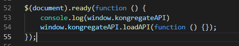 JavaScript API自动创建一个名为kongregateAPI的全局变量。可以使用此对象使用loadAPI和getAPI函数初始化Kongregate服务:
