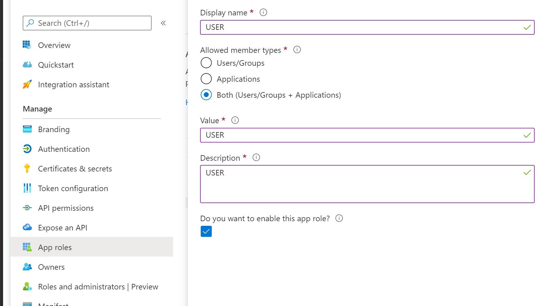 首先,如果需要应用程序分配,您需要为应用程序设置一个用户角色。如果没有,就没有问题。如果需要应用程序分配,请返回api权限,并在我的api中为创建的角色授予权限,请参阅Microsoft文档url。