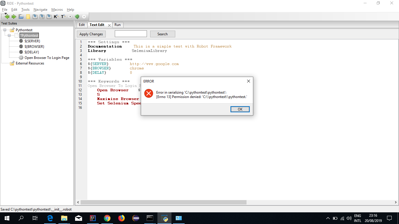 我使用机器人框架在Ride中创建了一个测试用例。在运行过程中,我得到了错误。