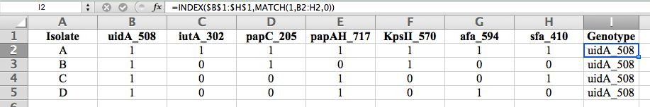我正在测试细菌是否存在五种基因,并想报告基因型(一份基因列表)。我在每一栏里都列出了基因。如果该基因存在于样本中,则得到1,如果没有,则输入为0。