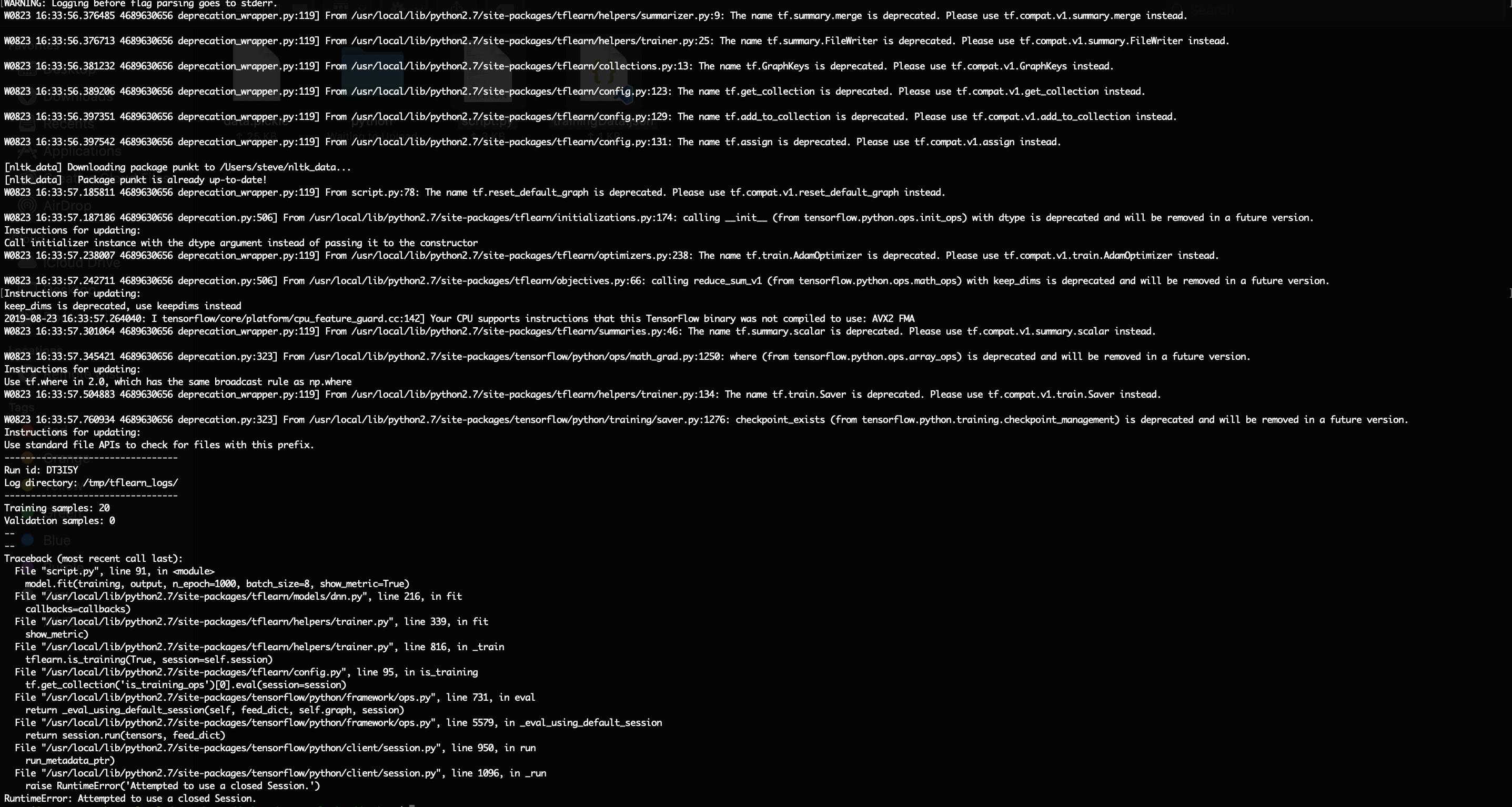 model.save("model.tflearn")但是这个错误似乎关闭了tf.session(),所以它不能正确地运行fit()。