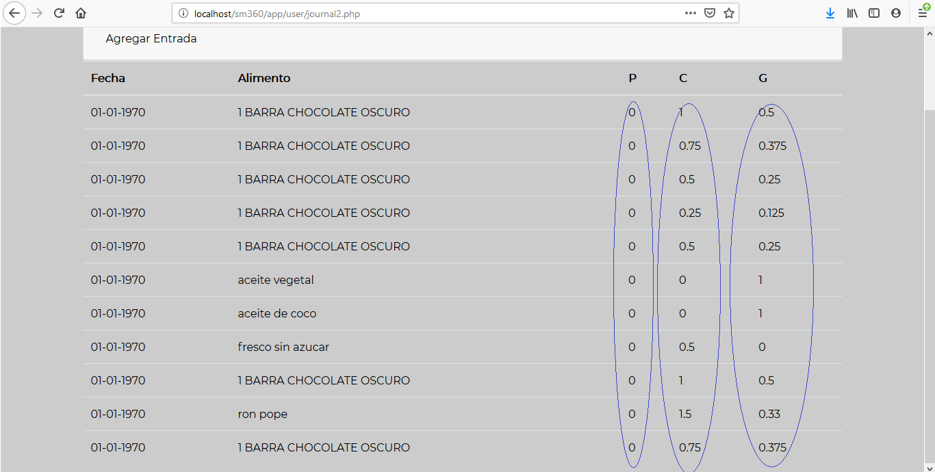 我想知道如何在PHP上计算所有显示元素的总和,我有一个包含每种食物所包含的蛋白质、碳水化合物和脂肪数量的食物数据库,所以我有另一张表格,用户可以输入他们正在吃的食物和份量,所以我把蛋白质、碳水化合物和脂肪的数量按比例乘以,给出了一个与数据库中的值不同的值。例如,在数据库中,一块巧克力含有0蛋白质、1碳水化合物和0.5脂肪,所以如果用户输入0.5部分,那么打印出来的值是0蛋白质0.5碳水化合物和0.25脂肪。