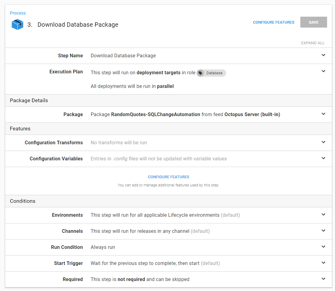 我正在通过Redgate软件和TeamCity实现Server数据库的CI/CD。我成功地构建了NuGet数据库包并将其推送到八达通。我可以在八达通图书馆部分看到NuGet包。但是,在将该包部署到Server时,我遇到了一些问题。我找不到内置的步骤模板“部署一个NuGet包”在八达通过程部分。我也尝试过“部署一个包”步骤模板,但它没有工作,我正在遵循这个指南。