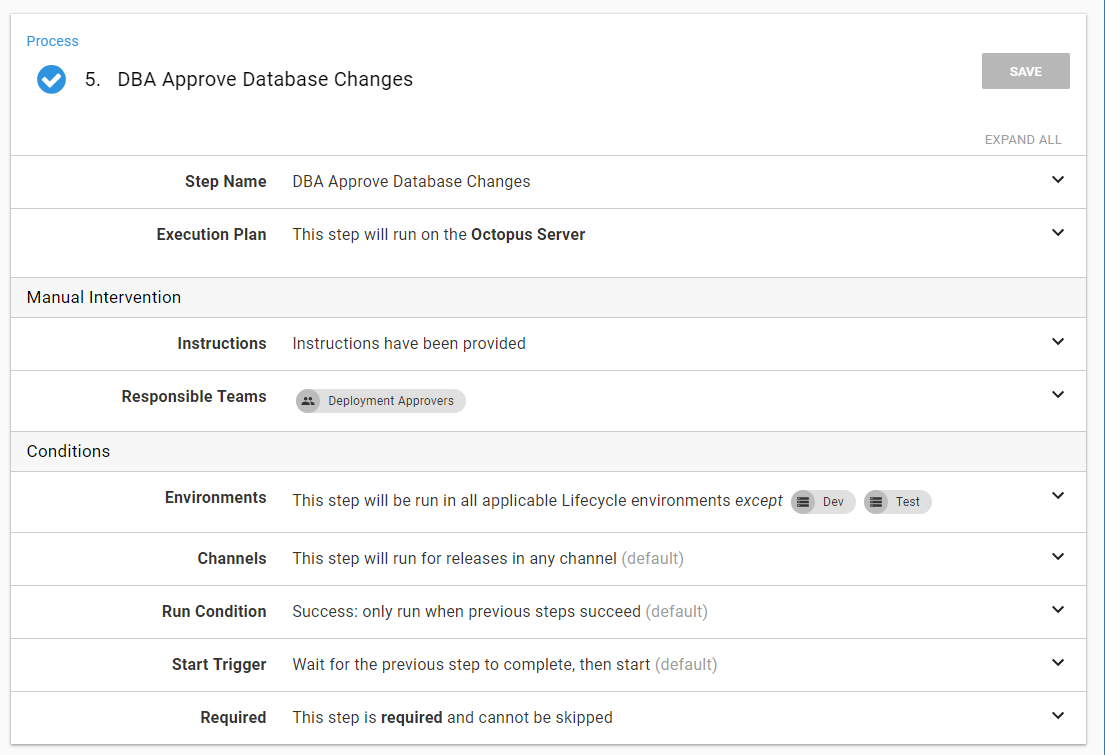 C:\RedGate\#{Octopus.Project.Name}\#{Octopus.Release.Number}\Database\Export下一步是批准数据库发布。我建议创建一个自定义团队来负责这方面的工作。我倾向于在Dev和QA中跳过这一步。