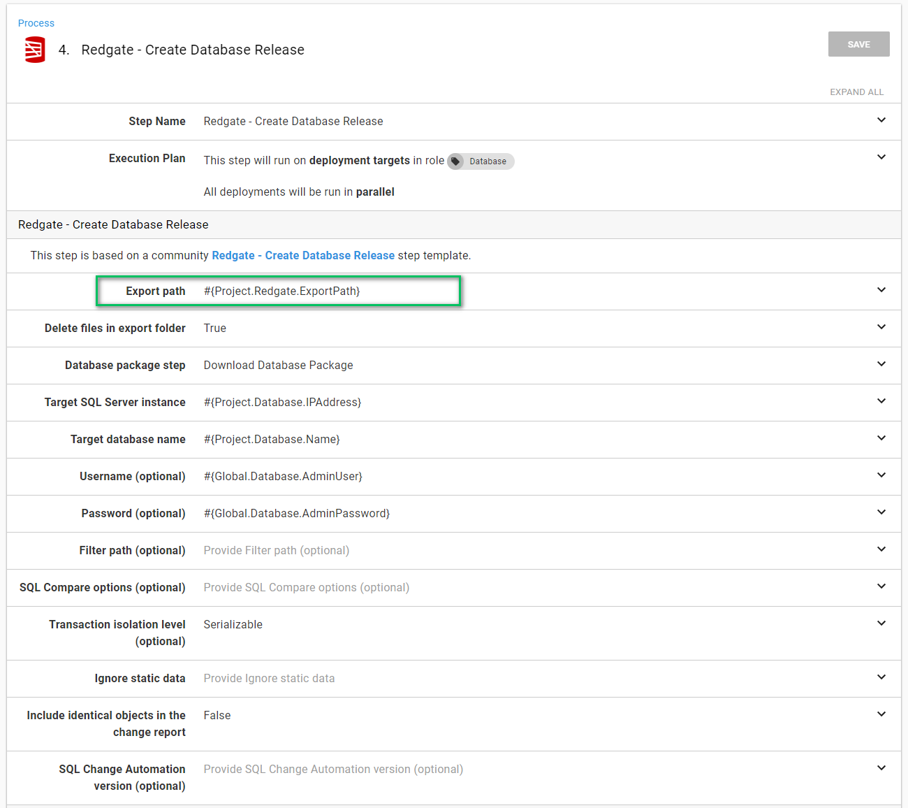 Redgate - Create数据库发布步骤更有趣一些。这是生成将在数据库上运行的实际增量脚本的步骤。大多数人的绊脚石是出口之路。导出路径是将增量脚本导出到的位置。这需要是八达通部署触须文件夹之外的目录。这是因为"Redgate -“步骤需要访问该路径,而Tentacle文件夹对于每个步骤都是不同的。