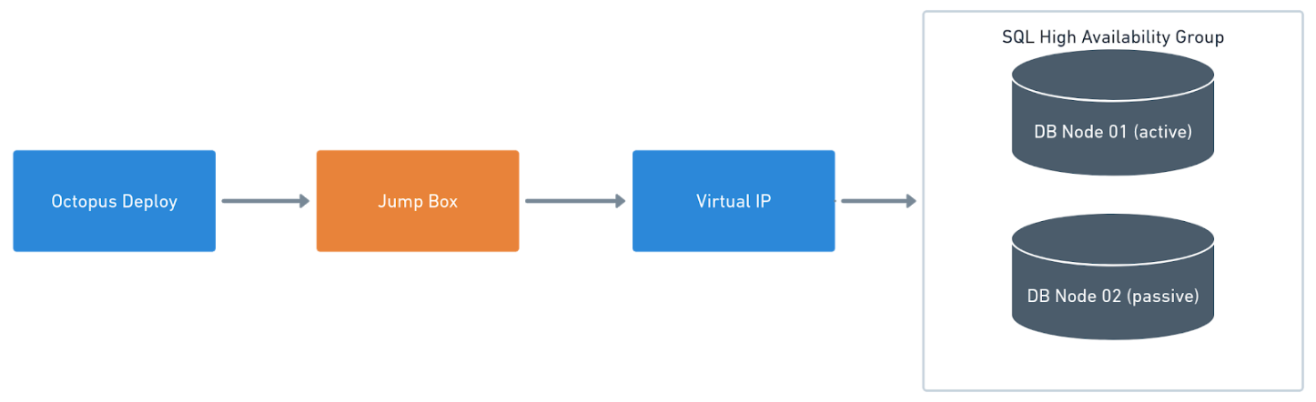 如果要在两个节点上安装触手,Octopus部署将尝试同时在两个节点上运行更改脚本(默认情况下)。那会引起很多戏剧性的。我建议使用跳转框,因为您需要一些东西在Octopus和Server之间。当您对此感到满意时,我会建议您使用员工(但这有点让人毛骨悚然,所以我不打算讨论这个问题)。