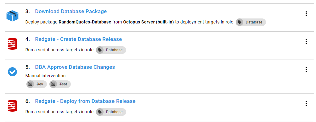 很好的问题是,要在八达通部署中使用Redgate的工具,您需要安装他们提供的step模板。我推荐创建数据库版本和部署数据库版本。当您浏览步骤模板时,您可能会注意到步骤模板到直接从包中部署。state自动化的基于状态的功能通过将存储在NuGet包中的数据库的状态与目标数据库进行比较来工作。每次运行时,它都会创建一组新的增量脚本来应用。因此,建议的程序是: