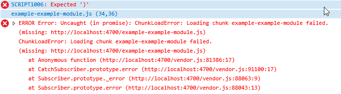 ERROR Error: Uncaught (in promise): ChunkLoadError: Loading chunk example-example-module failed.
