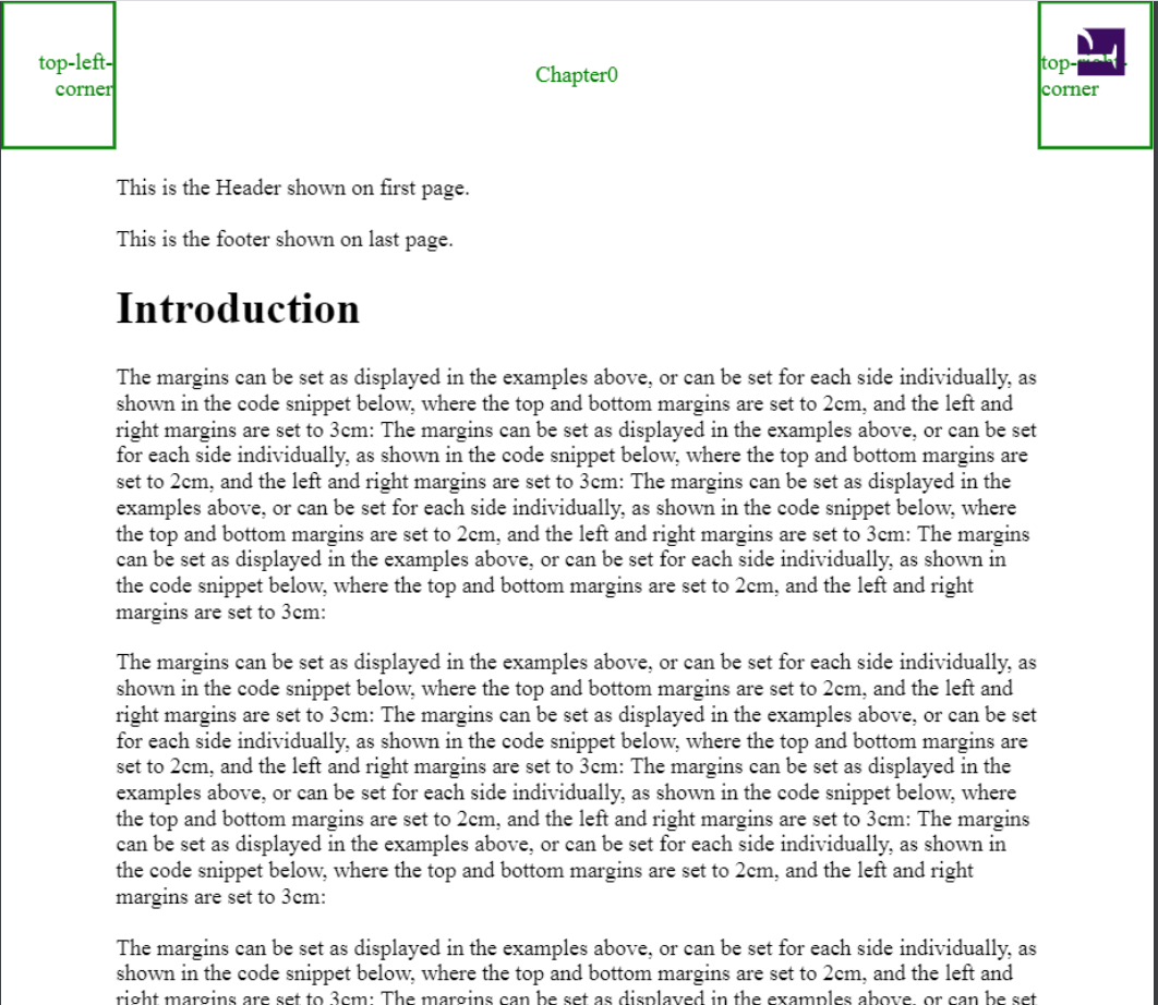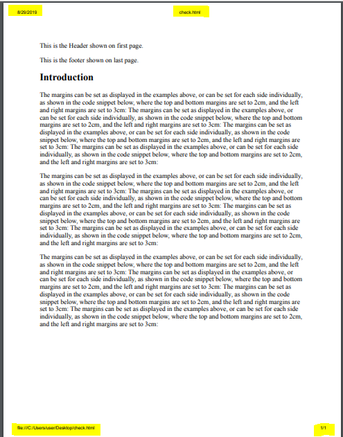 The margins can be set as displayed in the examples above, or can be set for each side individually, as shown in the code snippet below, where the top and bottom margins are set to 2cm, and the left and right margins are set to 3cm:</p>