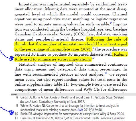 当您生成描述性统计信息时,您将分别为每个推测的数据集生成这些统计信息。例如,从平均值的角度来看,您可以提供作为附加信息的数据集上的最低平均值和最高平均值。您可以提供这些平均值的平均值和计算出的数据集的平均值的标准差。这样,你的读者就会知道,这种归罪带来了多少不确定性。