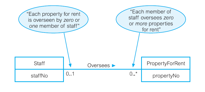 对于参与“导师”关系的教师和学生来说,说一位指导员在0到多次之间都参与这种关系是有意义的。然而,学生只能参加一次这种关系(假设一个学生不能有一个以上的导师)。因此,这是一对多的关系。
