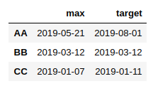 pd.concat([df.agg(process, axis=1), df[target]], axis=1).rename(columns={0:'max', target: 'target'})产出: