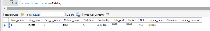 WHERE STR_TO_DATE(SUBSTRING_INDEX(time, '_', 1), '%m/%d/%Y') BETWEEN DATE('2019-9-3') AND DATE('2019-9-3');我已经尝试在time列上创建一个索引,用于筛选,但仍然得到了相同的结果: