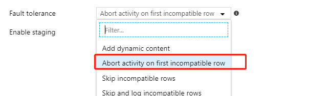1.如果您的意思是常见的不兼容或不匹配错误,则ADF支持复制活动中名为容错性的内置特性,该特性支持以下3种方案:
