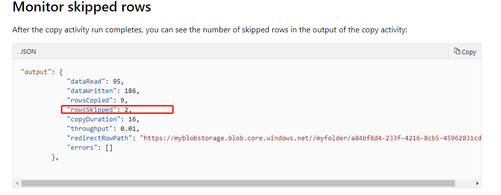 但是,我想出了一个想法,您可以在复制活动之后使用If条件活动来判断输出是否包含rowsSkipped。如果是这样,则输出False,那么您将知道有一些跳过数据,以便您可以在blob存储中检查它们。