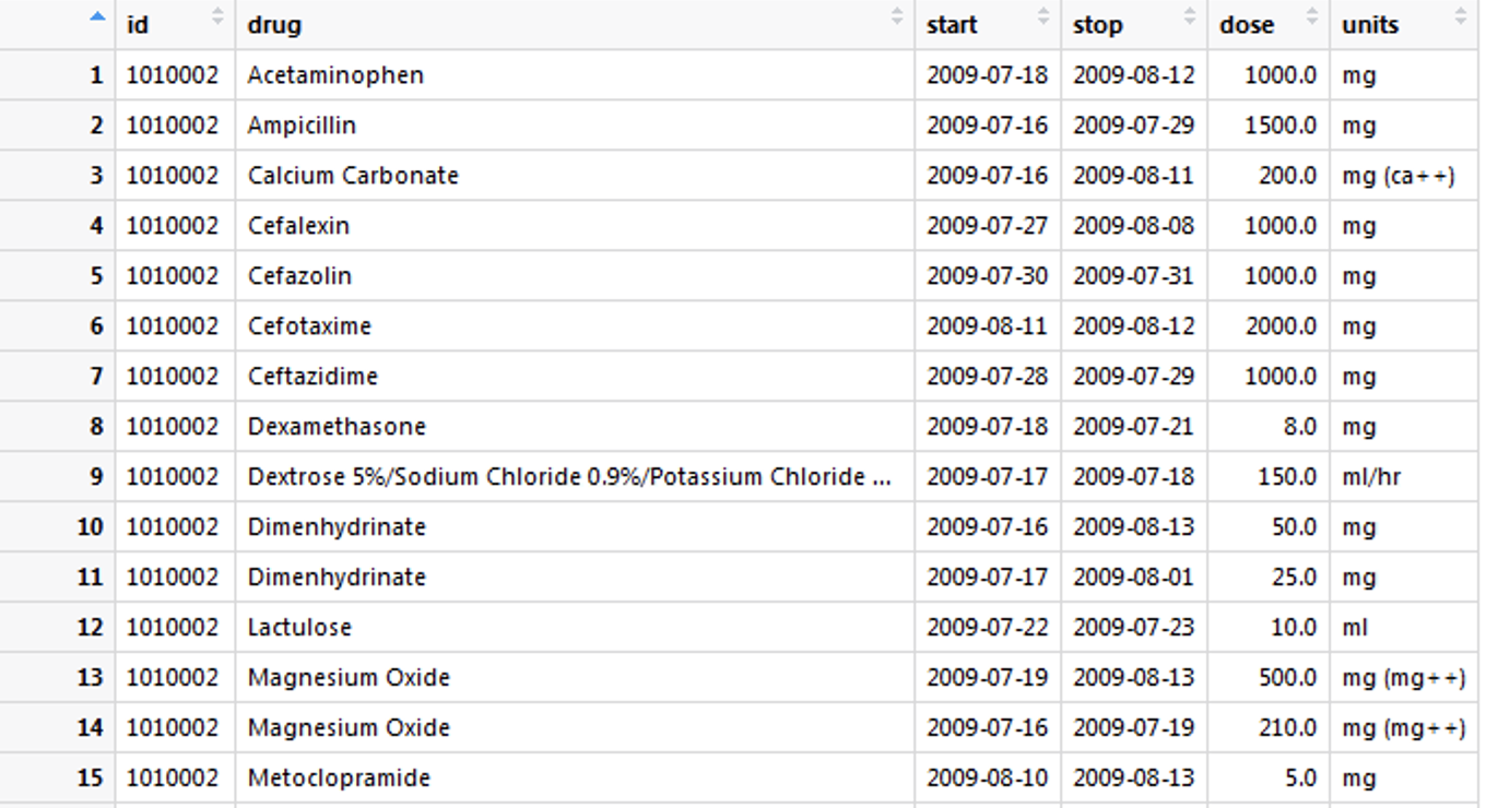 1010002), drug = c("Acetaminophen", "Ampicillin", "Calcium Carbonate",