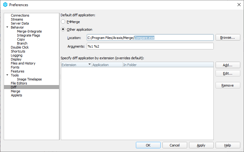 下面是正确的p4v配置的示例片段。在菜单中,goto > Preferences,然后转到Diff部分。