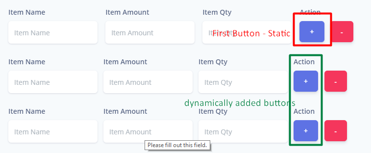 $(wrapper).append('<div class="pl-lg-7" id="toremove"> <div class="form-check-inline"> <div class="form-group{{$errors->has('item_name') ? ' has-danger' : ''}}"> <label class="form-control-label" for="input-name">{{__('Item Name')}}</label> <input type="text" name="item_name[]" id="input-name" class="form-control form-control-alternative{{$errors->has('item_name') ? ' is-invalid' : ''}}" placeholder="{{__('Item Name')}}" value="{{old('item_name')}}" required autofocus> @if ($errors->has('item_name')) <span class="invalid-feedback" role="alert"> <strong>{{$errors->first('item_name')}}</strong> </span> @endif </div></div><div class="form-check-inline"> <div class="form-group{{$errors->has('item_amount') ? ' has-danger' : ''}}"> <label class="form-control-label" for="input-name">{{__('Item Amount')}}</label> <input type="text" name="item_amount[]" id="input-name" class="form-control form-control-alternative{{$errors->has('item_amount') ? ' is-invalid' : ''}}" placeholder="{{__('Item Amount')}}" value="{{old('item_amount')}}" required autofocus> @if ($errors->has('item_amount')) <span class="invalid-feedback" role="alert"> <strong>{{$errors->first('item_amount')}}</strong> </span> @endif </div></div><div class="form-check-inline"> <div class="form-group{{$errors->has('item_qty') ? ' has-danger' : ''}}"> <label class="form-control-label" for="input-name">{{__('Item Qty')}}</label> <input type="text" name="item_qty" id="input-name" class="form-control form-control-alternative{{$errors->has('item_qty') ? ' is-invalid' : ''}}" placeholder="{{__('Item Qty')}}" value="{{old('item_qty')}}" required autofocus> @if ($errors->has('item_qty')) <span class="invalid-feedback" role="alert"> <strong>{{$errors->first('item_qty')}}</strong> </span> @endif </div></div><div class="form-check-inline"> <div class="form-group{{$errors->has('item_name') ? ' has-danger' : ''}}"> <label class="form-control-label" for="input-name">{{__('Action')}}</label> <div class="text-center"> <a class="btn btn-primary text-white add_form_field">{{__('+')}}</a> <a class="btn btn-danger text-white delete">{{__('-')}}</a> </div></div></div></div>'); //add input box