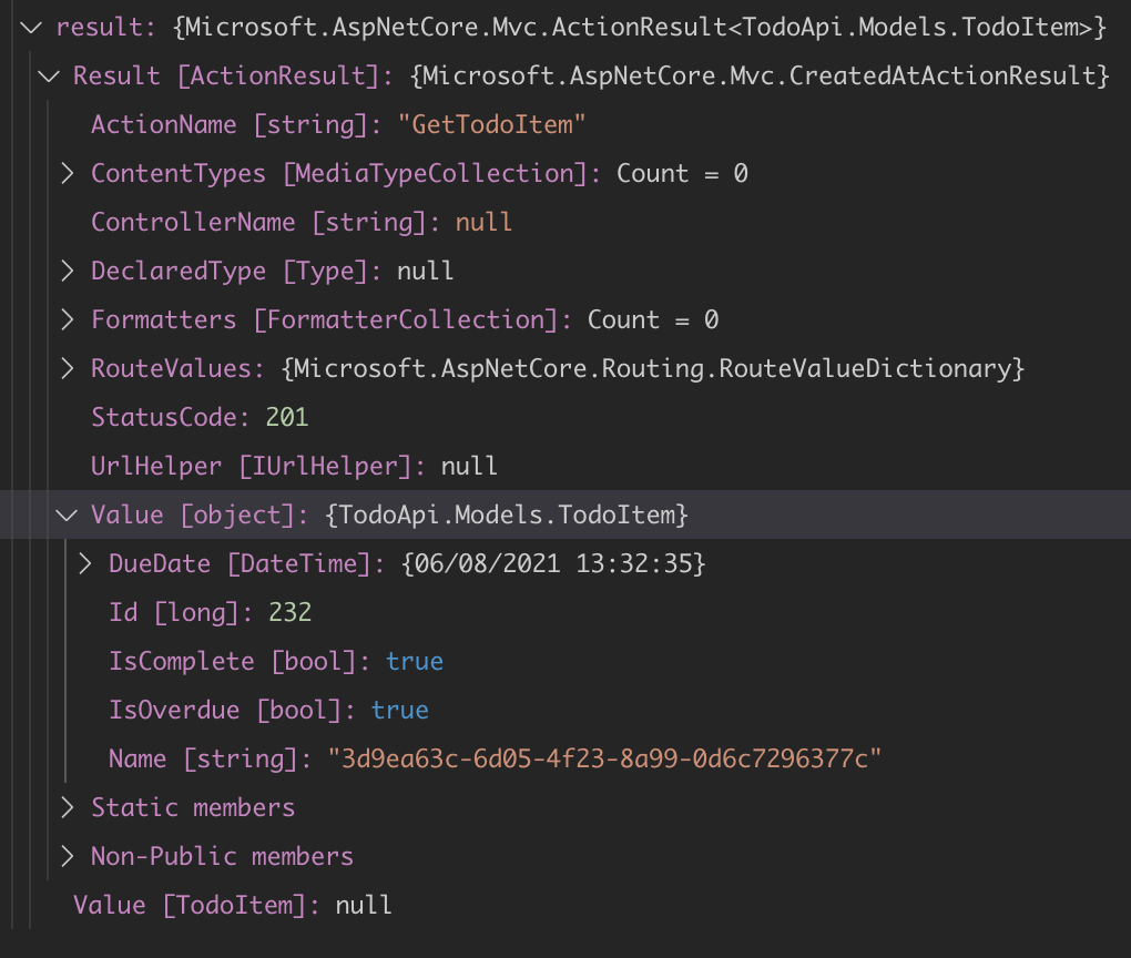 在这里,这似乎是对象模型中的一个奇怪之处。但我不知道原因。您调用CreatedAtAction,它返回一个CreatedAtActionResult。它具有一个值属性,它是一个对象。这就是您要传递TodoItem的内容,您可以在调试器输出中看到它。
