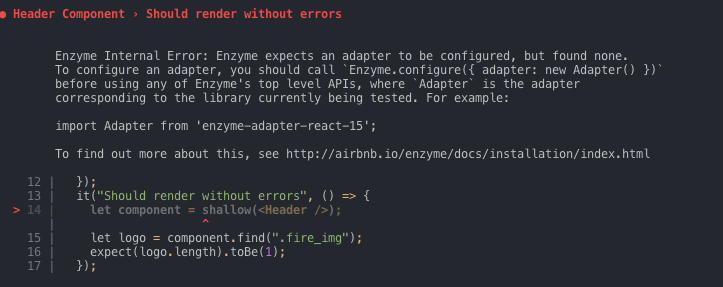 我想测试我的组件是否显示,并且我有一个浅层错误(见错误图像)。我使用的是:“酶”:"^3.10.0",“酶-适配器-反应-16”:"^1.14.0",“开玩笑-酶”:"^7.1.1",“开玩笑”:"^24.8.0“